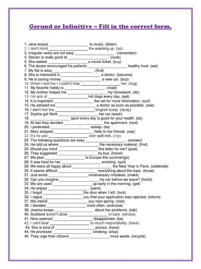 Print worksheets for learning about verbals. Useful for teaching and learning gerunds and infinitives after certain verbs. · they keep on fighting. · you recommended waiting until . Gerunds and infinitives (change in meaning).
